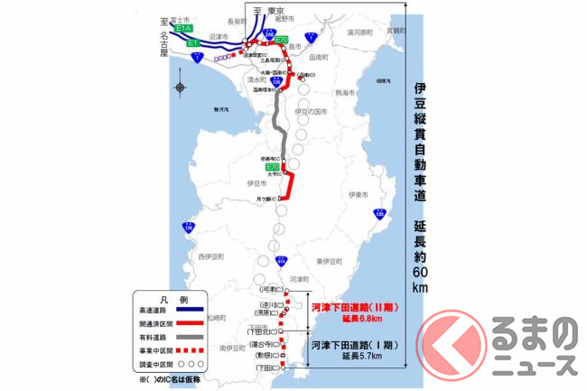 一方で、伊豆中央道との並行区間となる函南ICから修善寺JCT(仮称)までの約16kmと、月ケ瀬ICから河津ICまでの約20kmは「調査中」となっています。