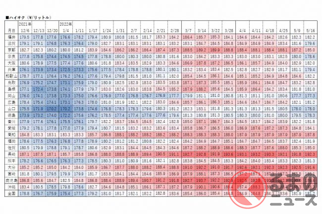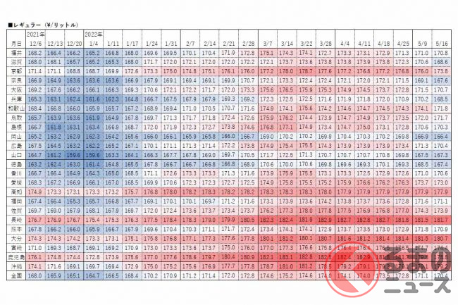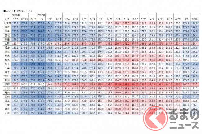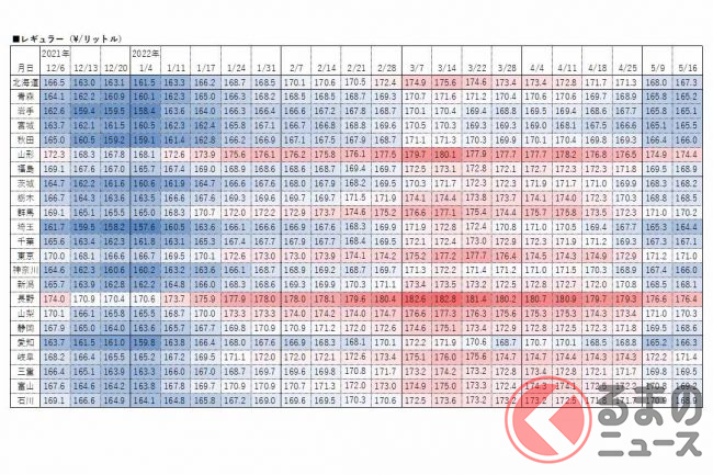 資源エネルギー庁は2022年5月18日、レギュラーガソリンの5月16日時点の店頭小売価格(消費税込)を発表しました。