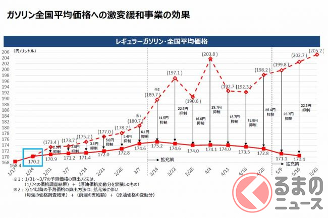 なお、経産省によると、補助金がない場合のレギュラーガソリンの全国平均小売価格は、5月16日時点で1リットル202.7円と算出しており、来週5月23日時点では205.2円に上がると予測しています。