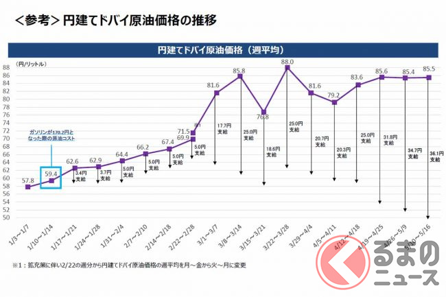 ガソリン価格の高騰を受け、政府は石油元売り企業に補助金を出す価格抑制策を実施。ガソリン、軽油、灯油、重油を対象に2022年1月27日から1リットルあたり5円、3月10日から25円を上限として支給しています。