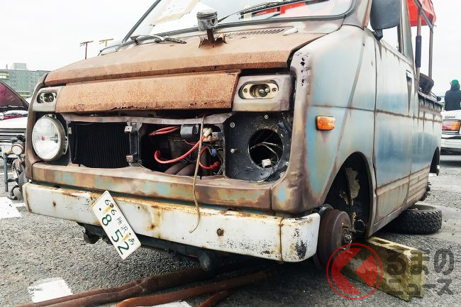放置車輌に近づけるカスタムは大変かと思う人も多いかもしれませんが真心商会(鹿)さんによると、「普段からこの仕様で乗ってるので、今回は荷台に粗大ゴミ積んで来て会場でタイヤとか外しただけです」とのことで、イベントのために大幅なカスタムをおこなったわけではないようです。