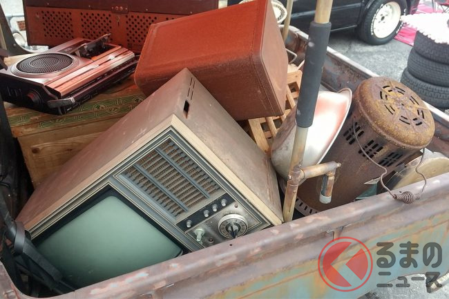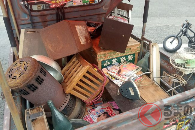 その言葉通り、荷台には、年季の入ったブラウン管テレビや石油ストーブ、扇風機や一升瓶、アダルト雑誌などが積み込まれ、古き良き昭和の雰囲気が演出されています。