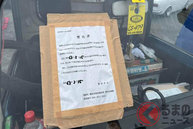 極めつけには、フロントウィンドウに昭和63年2月15日付けの「警告書」が貼られ、「放置したと見られるこの自動車等の所有者等は、市の管理上支障となっておりますので、至急この自動車等を撤去するなど適正な処理をしてください」と記されています。