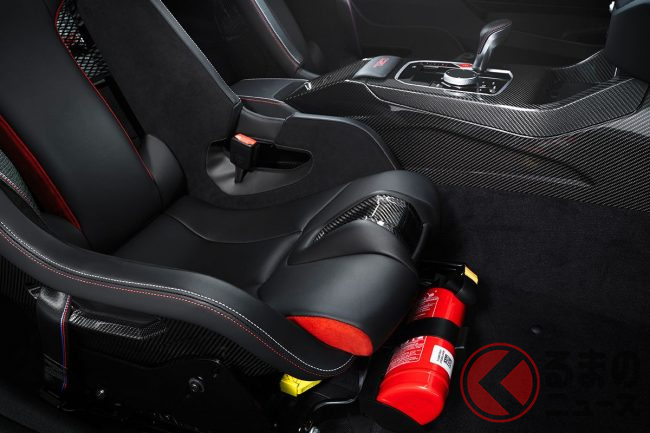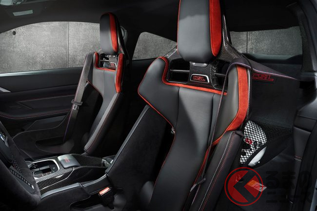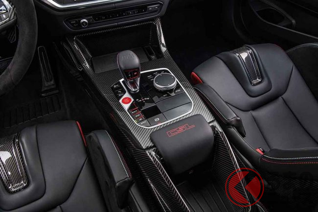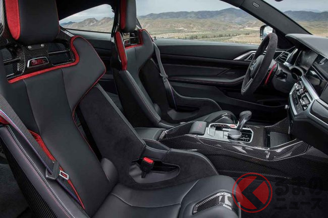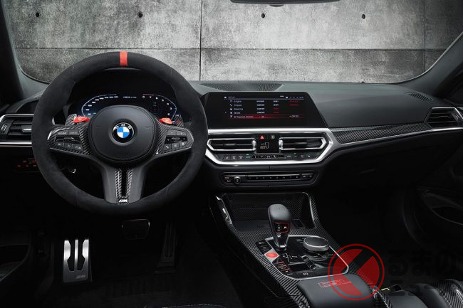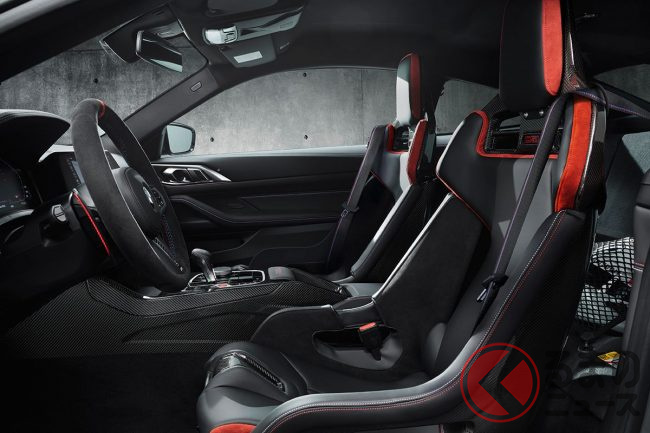 Mカーボンフルバケットシートは、M4コンペティションクーペに装着されている標準シートと比較して約24kg、また後部座席とシートベルトを統合し、荷室の変更を加えることで約21kgの軽量化を実現しています。さらにMカーボンセラミックブレーキや軽合金ホイール、ストラット、スプリングなどシャシの変更で約21kg、防音の凌を減らし超軽量の断熱材に置き換えることで約15kg、ボンネットなどCFRP素材に置き換え約11kg、チタン製リアサイレンサーで4kg以上、キドニーグリルやリアライト、フロアマットなど細部の変更によりさらに4kgが削減されています。