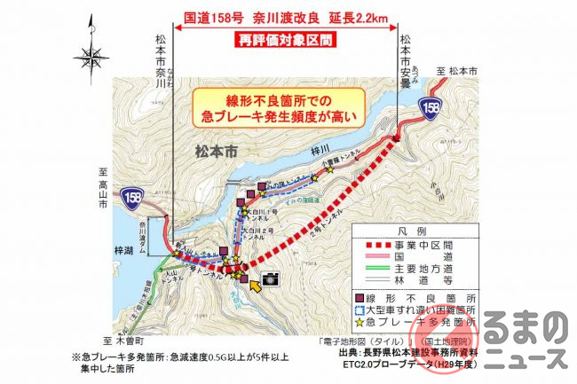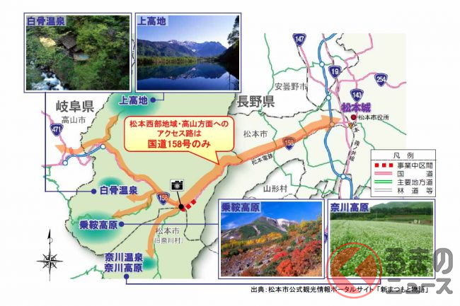 長野県松本市から西へ延びる国道158号は、首都圏と上高地や乗鞍高原、白骨温泉、岐阜県の飛騨・高山方面などを結ぶメインルートです。多くの観光地を結ぶことや主要道がほかにないことから、マイカーはもちろん、観光バスなどの大型車も多く通ります。