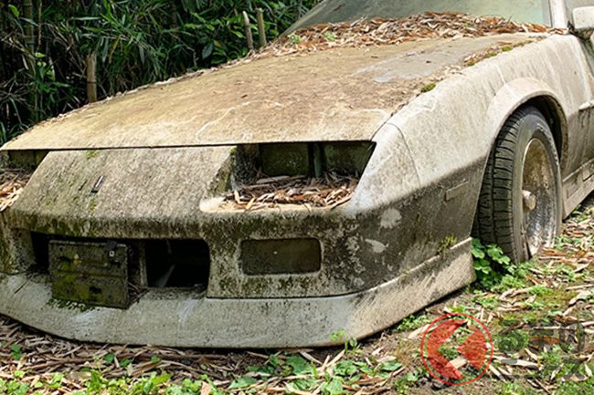 そこには、竹藪に覆われた一角に1台のクルマが停まっており、枯れ葉や全体的に汚れが付着していることから長年放置されていることがうかえます。