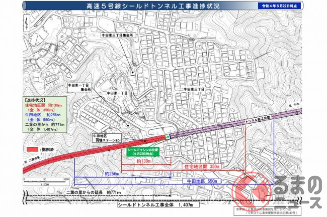 広島高速道路公社は2022年5月23日、高速5号線(東部線)のシールドトンネル工事の進捗状況を更新しました。