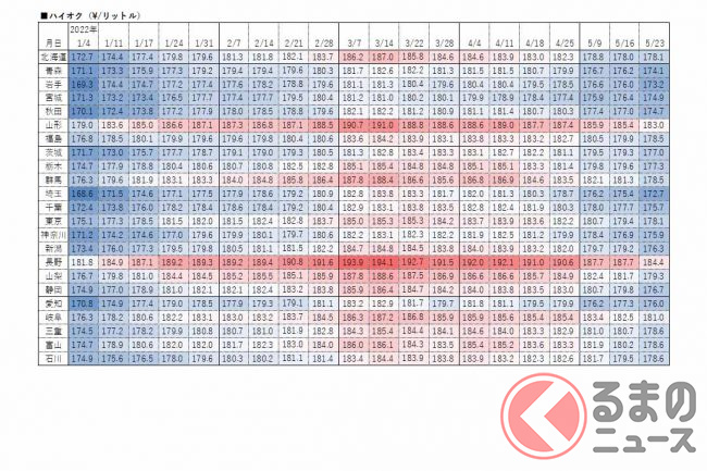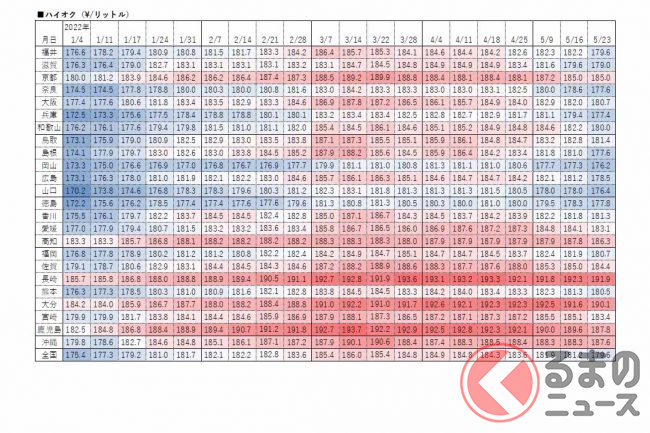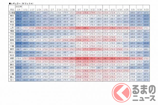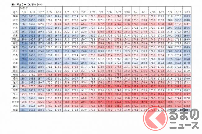 資源エネルギー庁は2022年5月25日、レギュラーガソリンの5月23日時点の店頭小売価格(消費税込)を発表しました。