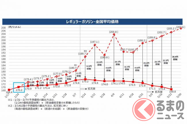 なお、経産省によると、補助金がない場合のレギュラーガソリンの全国平均小売価格は、5月23日時点で1リットル205.2円と算出しており、来週30日時点では207.6円に上がると見ています。