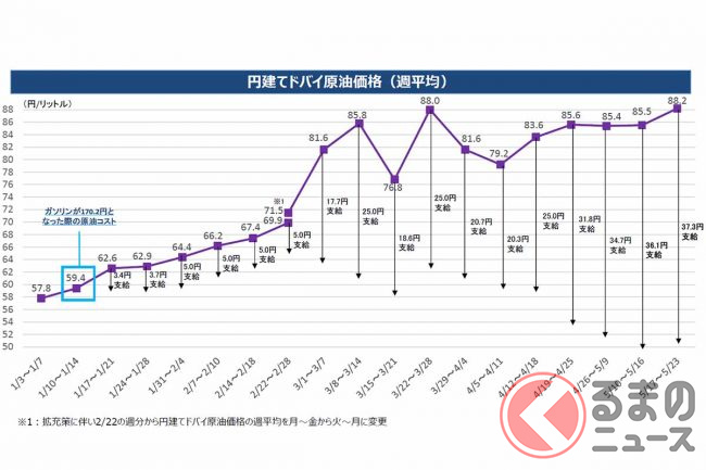 ガソリン価格の高騰を受け、政府は石油元売り企業に補助金を出す価格抑制策を実施。ガソリン、軽油、灯油、重油を対象に2022年1月27日から1リットルあたり5円、3月10日から25円を上限として支給しています。
