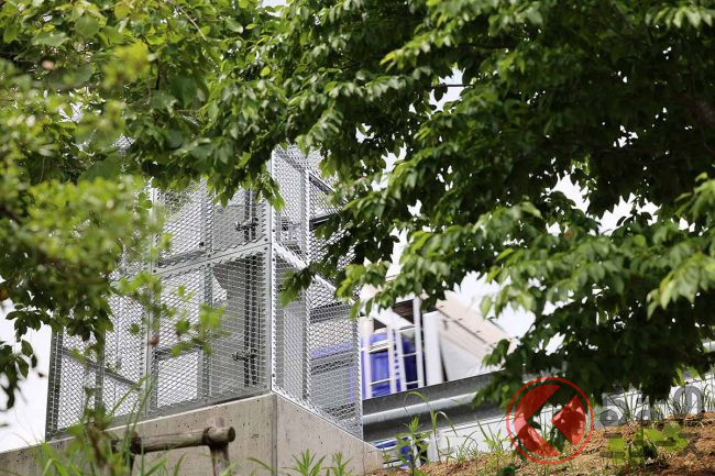 オービスガイドに写真付きでオービスの投稿があり、すぐに現場へ直行。その情報通り、金網で覆われた拠点の中に、ストロボやカメラのオービス本体がセットされていました。