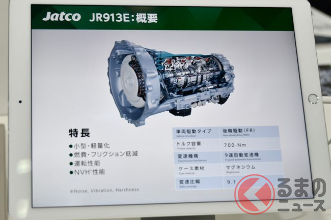 担当者はJR913Eについて、「9速というギア段数については、他メーカーの多段ATなどを徹底的にベンチマーク評価したうえで決定しました。従来の7速ATよりもコンパクトかつ軽量に仕上がっており、搭載性も向上しています。開発を進めるうえで、700Nmという大トルクに対応できるよう強度を高めながら、同時に小型軽量化や振動を抑制するという点に苦労しました」としています。