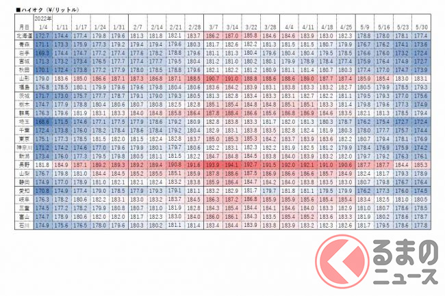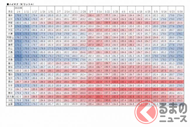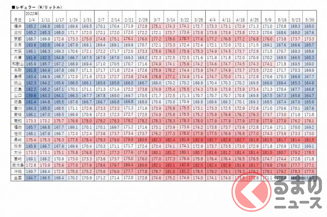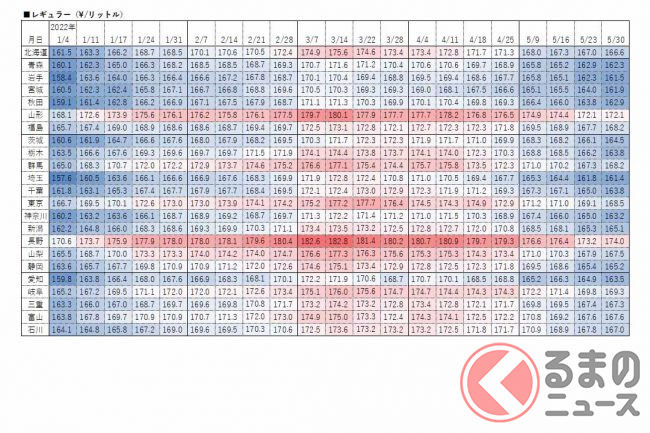 資源エネルギー庁は2022年6月1日、レギュラーガソリンの5月30日時点の店頭小売価格(消費税込)を発表しました。