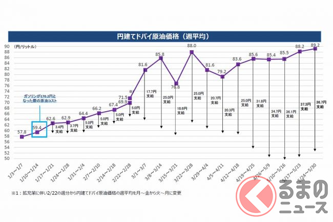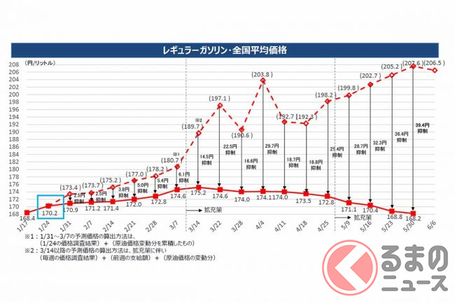 なお、経産省によると、補助金がない場合のレギュラーガソリンの全国平均小売価格は、5月30日時点で1リットル207.6円と算出しており、来週6月6日時点では206.5円になると見ています。