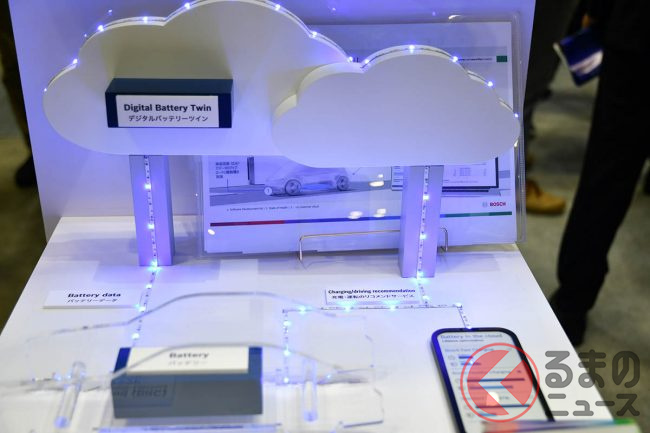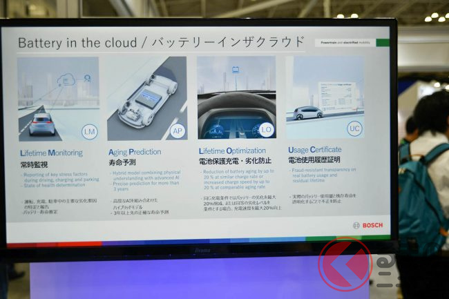 その中でも注目だったのは「バッテリーインザクラウド」です。これはEVのバッテリー寿命を正確に予測できるようになるクラウドベースサービスで、クルマをネットワークに繋げることにより「常時監視と異常検知」「寿命予測」「電池保護充電・劣化防止」「電池使用履歴証明」の、4つのサービスを提供するというもの。