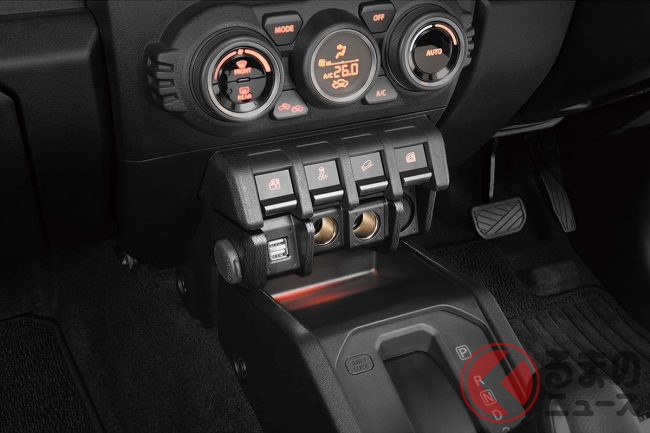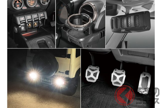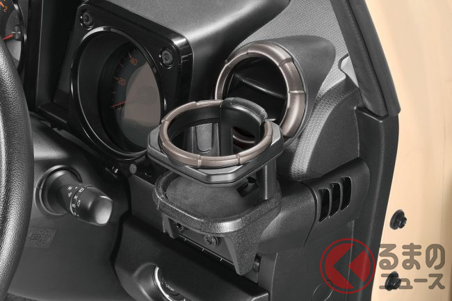 デモカーは、スズキのエンブレムまでブラックアウトされたデザインで精悍な印象となっているほか、同社が開発したアクセサリー「“まるで純正”シリーズ」を装備。ジムニー専用ドリンクホルダーや増設電源ユニットなどが装着されます。