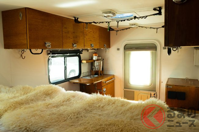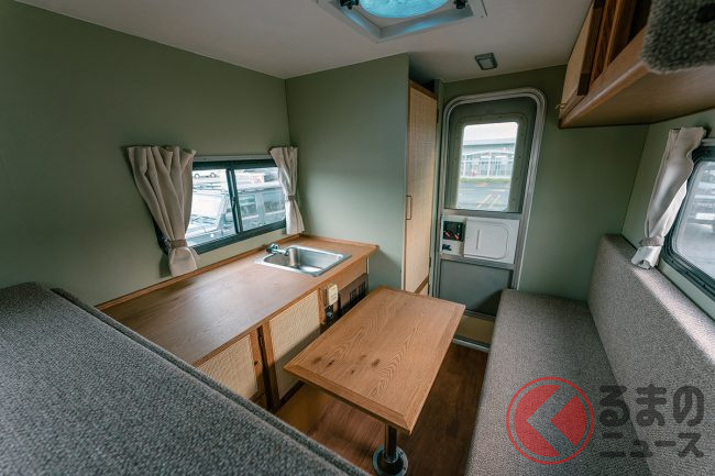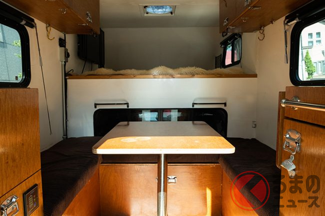 車内にはバンクベッド、ソファ 、テーブル、キッチン、収納、電源コンセント、LED照明などを装備。