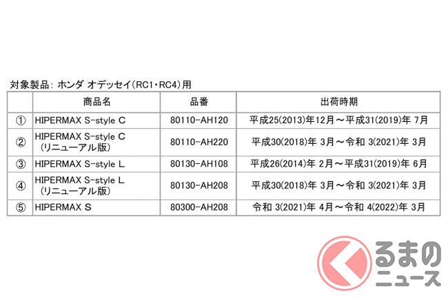 自動車用アフターパーツメーカーのHKS(エッチ・ケー・エス)は、2013(平成25)年12月から販売をしているホンダ「オデッセイ(RC1、RC4)」用サスペンションキット、ハイパーマックスSの一部シリーズについて、部品交換の案内を2022年6月3日(金)に発表しました。