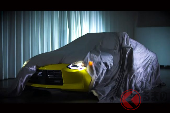 日産の公式動画は約1分。まず幕を被ったイカズチイエローの新型Zが、颯爽とアンベールされるシーンからスタートします。