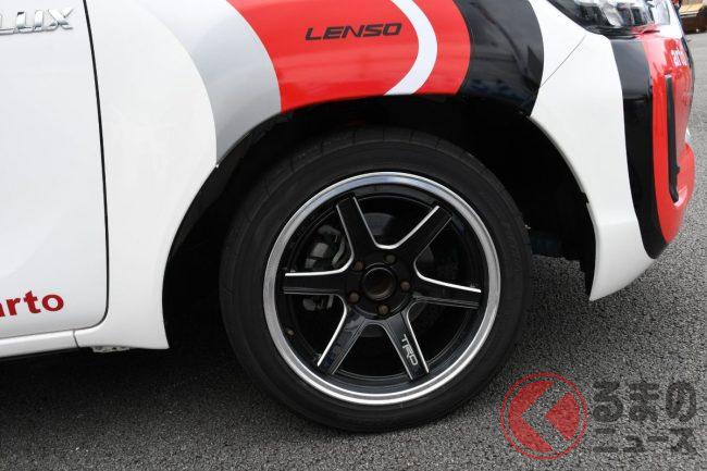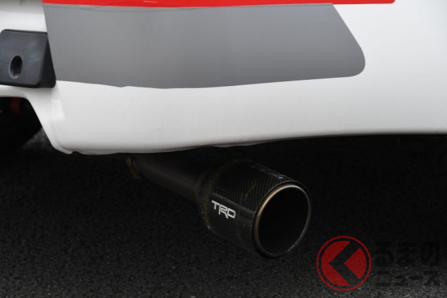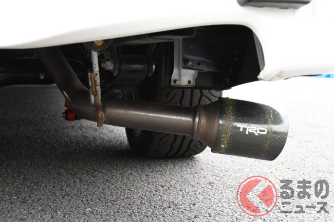 エクステリアでは、オーバーフェンダーで迫力を増しているほか、TRDのストレート+マフラーの装着や、足元は3インチダウンのTRDローダウンサスペンションに加えて、ヨコハマ アドバンに17インチTRDホイールを履いています。