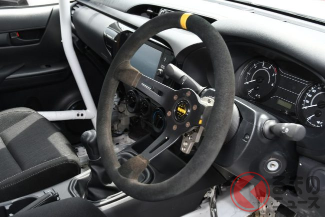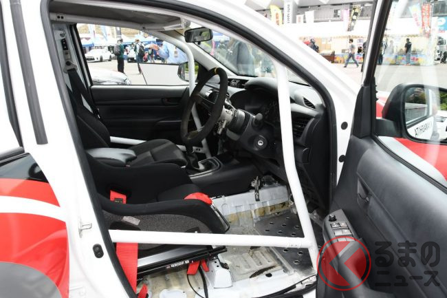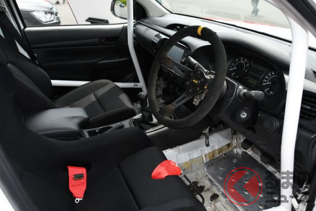 そんなワンメイクレースに参戦するハイラックスが展示されていますが、その改造内容も本格的です。