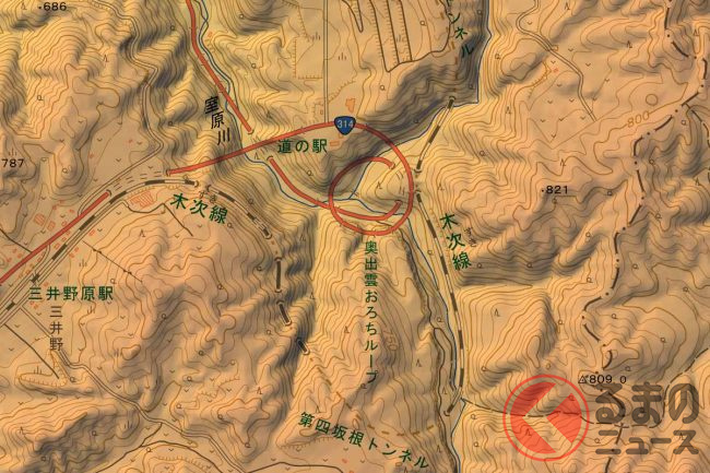 島根県南東部の奥出雲町を通る国道314号は、高低差105mを2周しながら上り下りする日本最大級のループ区間があります。1982年に着工され、1992年4月に開通しました。