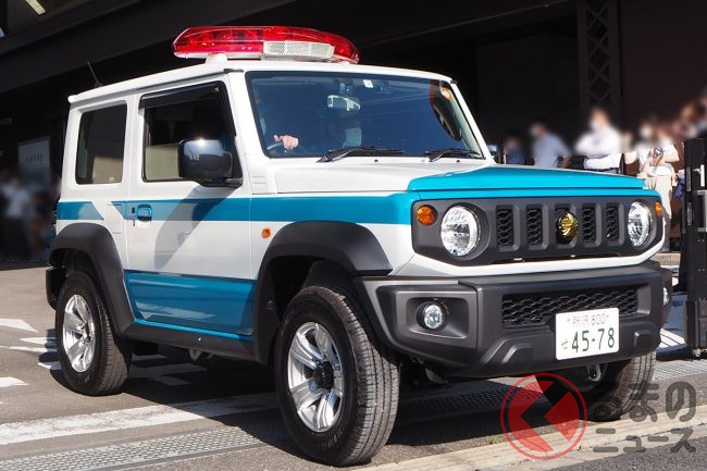 青白のスズキ「ジムニー警察車両」に熱視線? パトカー勢ぞろい「けいさつ車両展」に登場した災害対策車とは