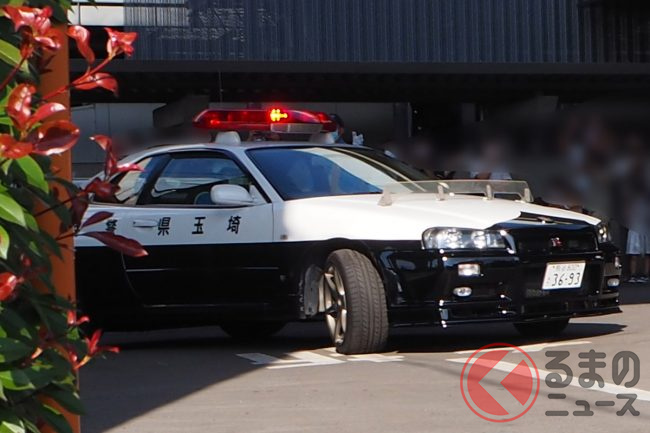 子どもから大人まで、多くの人から注目を集めた同車は、ルーフに赤色回転灯を備えるほか、フロントグリル内には旭日章(警察章)も確認できます。ただし、色はブルーとホワイトのツートーンです。