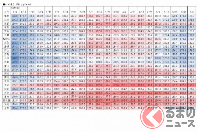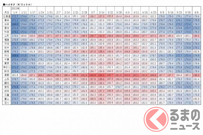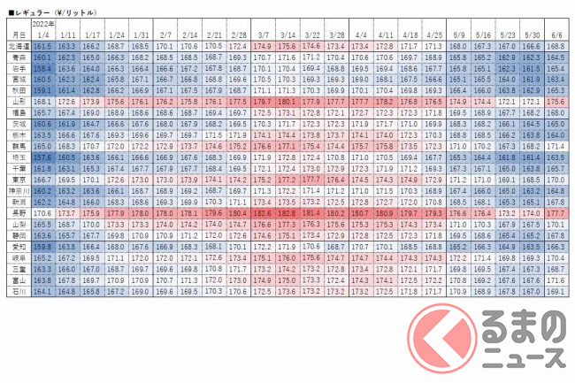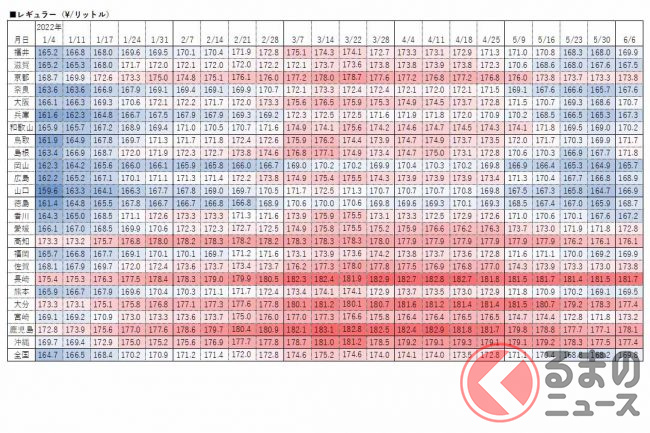 資源エネルギー庁は2022年6月8日、レギュラーガソリンの6日時点の店頭小売価格(消費税込)を発表しました。