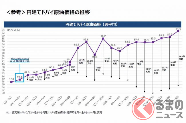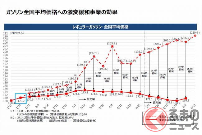 なお、経産省によると、補助金がない場合のレギュラーガソリンの全国平均小売価格は、6月6日時点で1リットル206.5円と算出しており、来週6月13日時点では210.6円になると見ています。