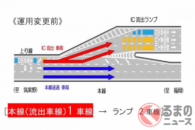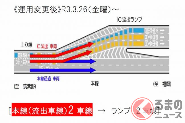 2021年3月に実施された対策では、上り本線3車線のうち、ICランプに流出する車線をそれまでの1車線から2車線に増やしました。