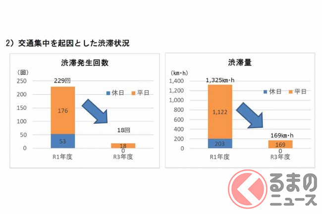 その結果、交通集中による渋滞の回数は、対策前(2019年度)の229回から対策後(2021年度)は92%減の18回に、渋滞量は同じく1325km・hから88%減の169km・hまで減少したといいます。