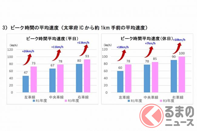 そして、太宰府IC手前約1km地点のピーク時間(17時台)の平均速度も改善。とくに一番左の第一走行車線は、平日は73km/h(プラス26km/h)、休日は78km/h(プラス18km/h)まで向上しました。