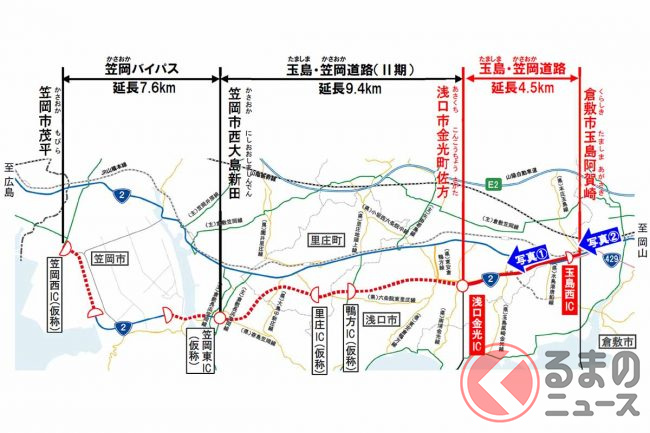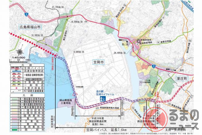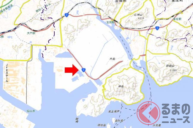 地図には国道2号の笠岡バイパスと記されていますが、大阪市と北九州市を結ぶ一桁国道のバイパスと名乗る割には“L”の両端が国道2号の現道につながっておらず、通るにしても遠回りとなるため、現在はバイパスの役割を果たしているとは言い難い状況です。