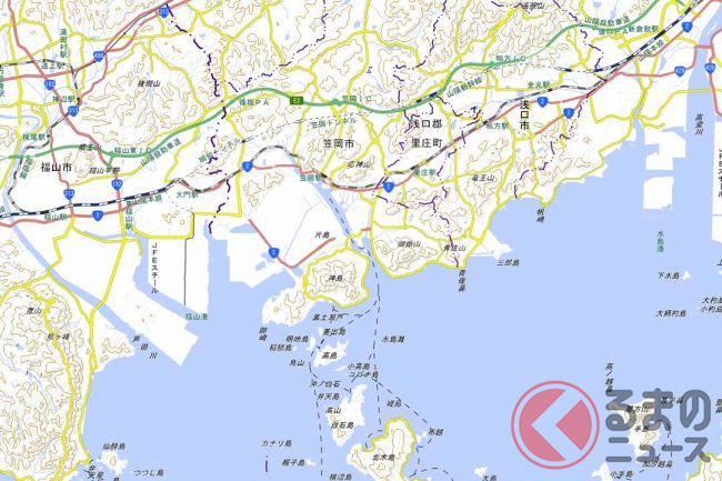 岡山県の瀬戸内海沿岸は山陽道と国道2号が東西を結ぶ動脈として機能していますが、県西部で広島県に接する笠岡市に目をやると、L字の形をした短い国道が畑の中にポツンと整備されているのが分かります。