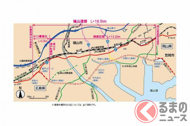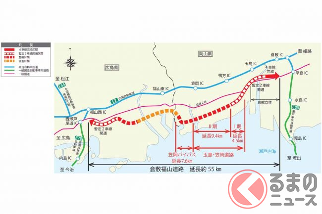 そしてこの笠岡バイパスは、地域高規格道路「福山倉敷道路」を構成しており、岡山県倉敷市から広島県福山市に至る延長約55kmのバイパス道路の一部となります。