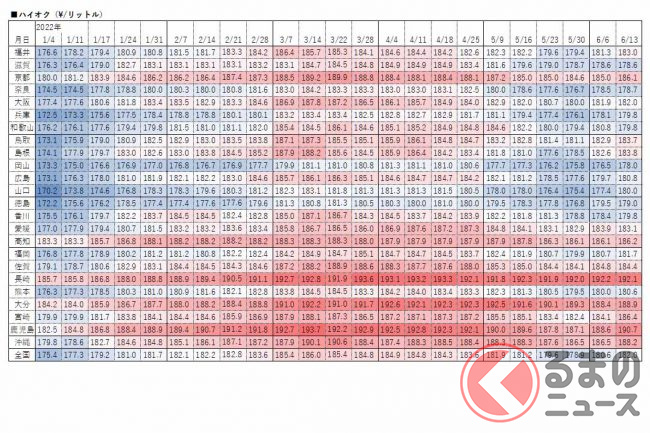 一方、もっとも高かったのは長崎県で181.5円、次いで鹿児島県179.9円、長野県179.8円でした。