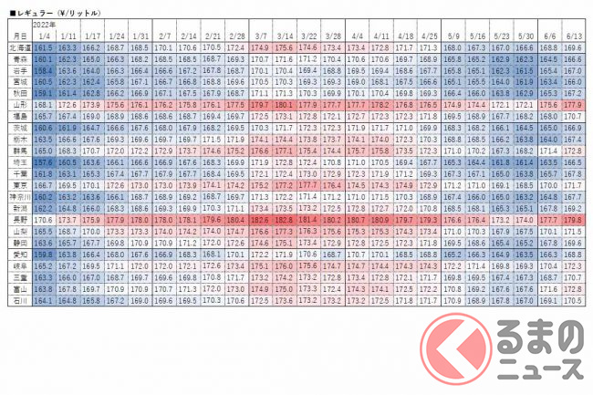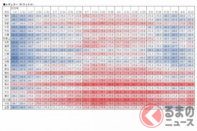 資源エネルギー庁は2022年6月15日、レギュラーガソリンの13日時点の店頭小売価格(消費税込)を発表しました。