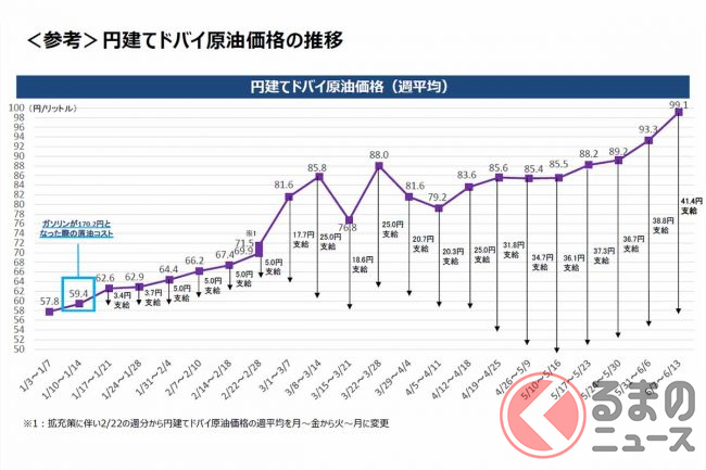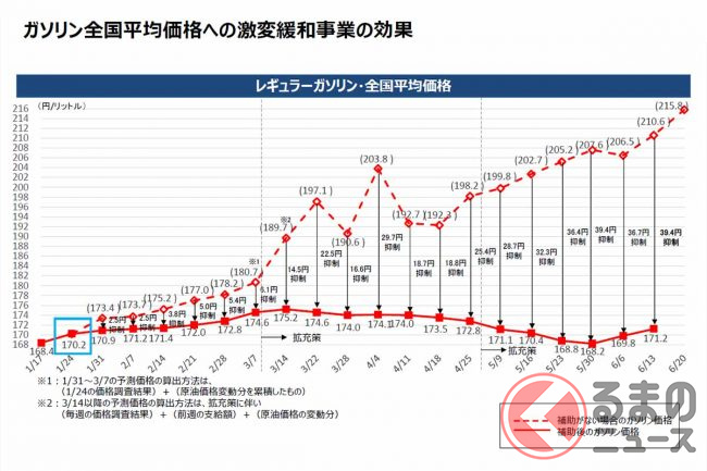 なお、経産省によると、補助金がない場合のレギュラーガソリンの全国平均小売価格は、6月13日時点で1リットル210.6円と算出しており、来週6月20日時点ではさらに上昇し215.8円になると見ています。