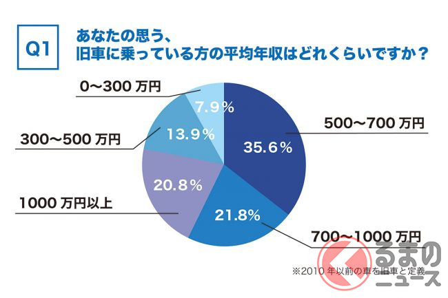 まず旧車オーナーの平均年収を予想してもらったところ、1位が35.6パーセントで「500~700万円」、2位の21.8パーセントが「700~1000万円」、3位が20.8パーセントで「1000万円以上」という予想結果になりました。