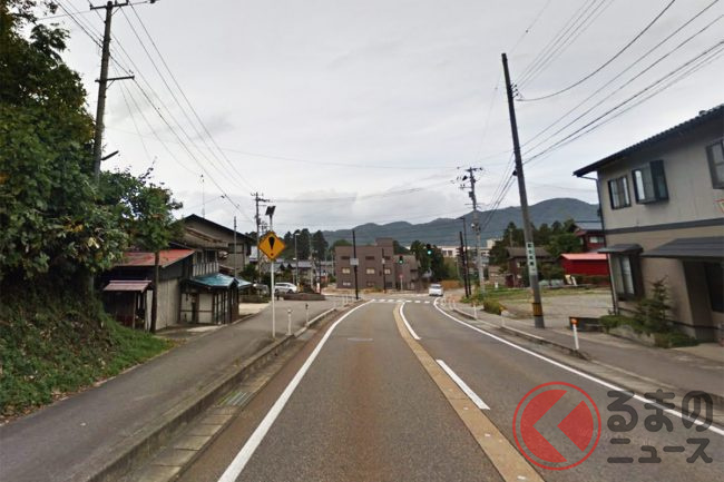 「平成16年当時、標識を設置した村上地域振興局地域整備部によると、この先に信号は無く、左カーブを主としたT字路でしたので、下り坂からの急カーブ及び合流車に注意するよう、この警戒標識が設置されました。平成19年に交差点が改良され、信号ができた今も、安全に運転できるよう、警戒喚起をしているそうです」