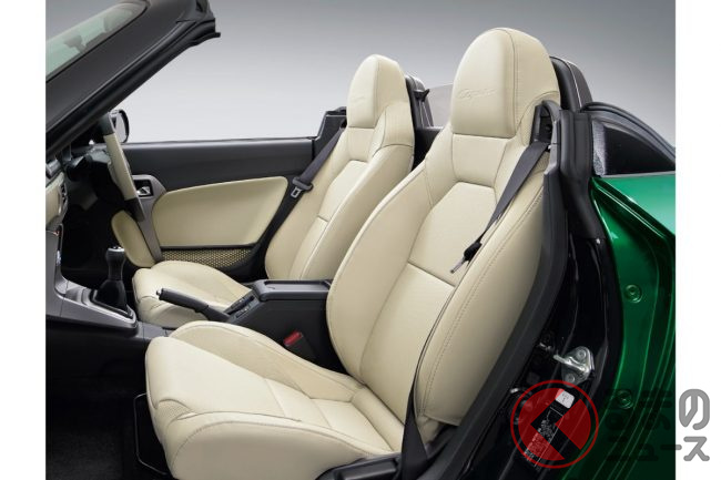 今回の20周年記念車のエクステリアは、丸目のヘッドランプが初代を想起させる「Cero」をベースに、1台1台職人が手作りでつくりあげるコペンの上質さを際立たせる特別装備として、2代目に初めて本革製のスポーツシートを採用しました。