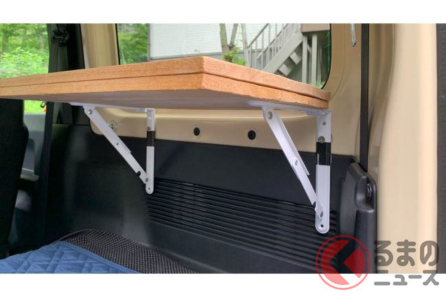 「運転席後にDIYで取り付けた市販品より大型なワンタッチリアサイドテーブルと、助手席後に自作した後部シートのバックレストホルダーを追加。ほかにガラスの目隠しシェードをDIYで自作しています。