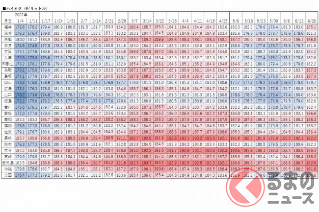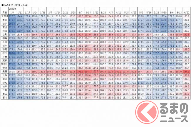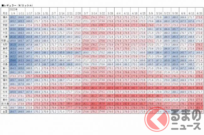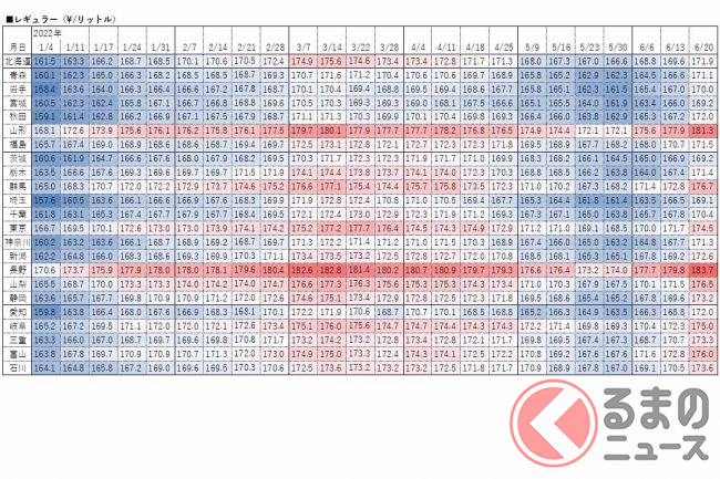 資源エネルギー庁は2022年6月22日、レギュラーガソリンの20日時点の店頭小売価格(消費税込)を発表しました。
