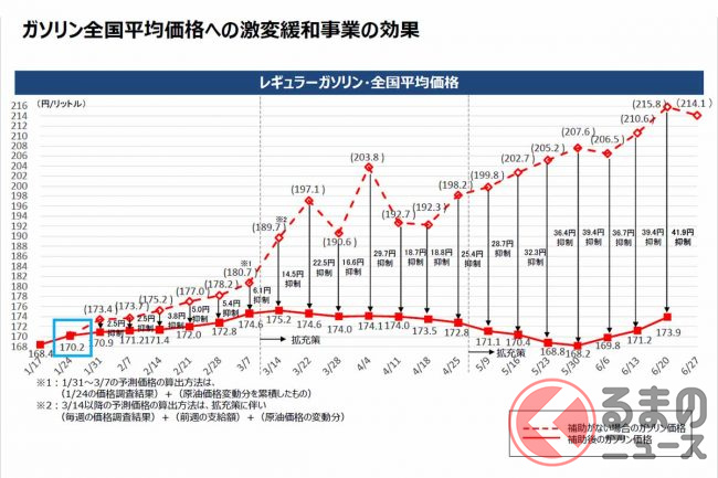 なお、経産省によると、補助金がない場合のレギュラーガソリンの全国平均小売価格は、6月20日時点で1リットル215.8円と算出しており、来週27日時点では214.1円になると見ています。