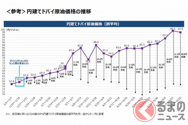 ガソリン価格の高騰を受け、政府は石油元売り企業に補助金を出す価格抑制策を実施。ガソリン、軽油、灯油、重油を対象に2022年1月27日から1リットルあたり5円、3月10日から25円を上限として支給しています。