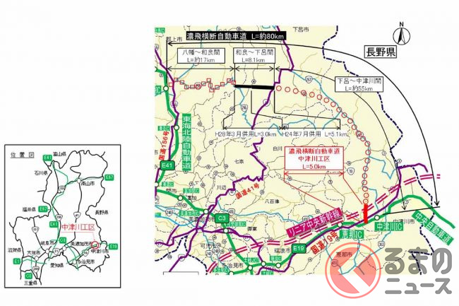 リニア岐阜県駅や中央道、国道19号ともICを介して接続することで速達性・定時性を確保するとともに、通過交通を分離して中津川市街の渋滞を減らすことなどが期待されています。