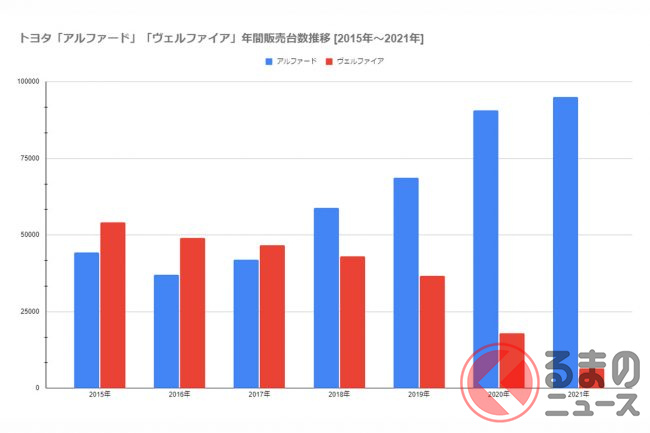 トヨタの高級ミニバン「アルファード」は、昨年2021年の1年間で約9万5000台を販売しています。月平均でおよそ7900台です。現行型デビュー時の2015年には約4万4000台だったことを考えると、販売台数は倍以上に伸びていることがわかります。