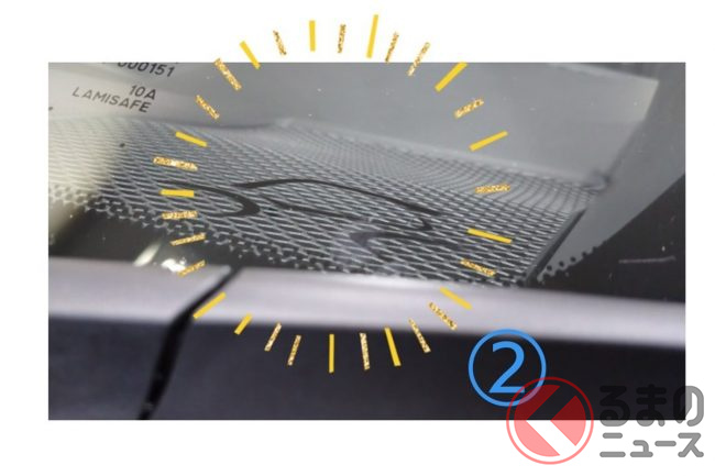 ボディ前側にあるマークとしては、「フロントウインドウ下部」や「前席ドア内側の付け根」。