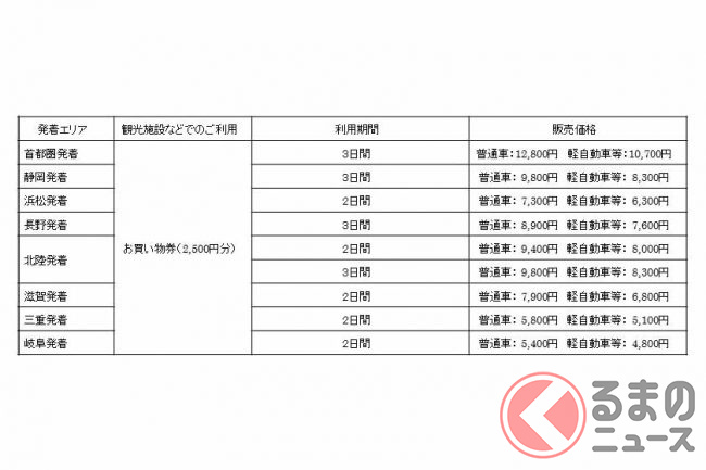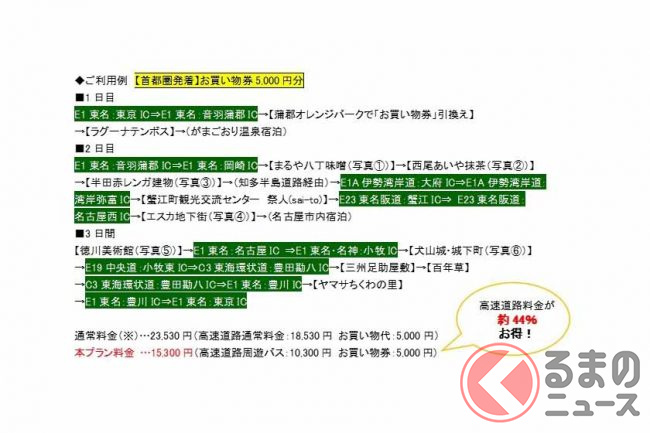 価格は、首都圏発着・3日間・買い物券2500円分の場合、普通車1万2800円、軽自動車1万700円です。ちなみに東名高速の東京IC~名古屋ICを普通車で単純往復すると土休日は1万800円、平日は1万4640円かかります。